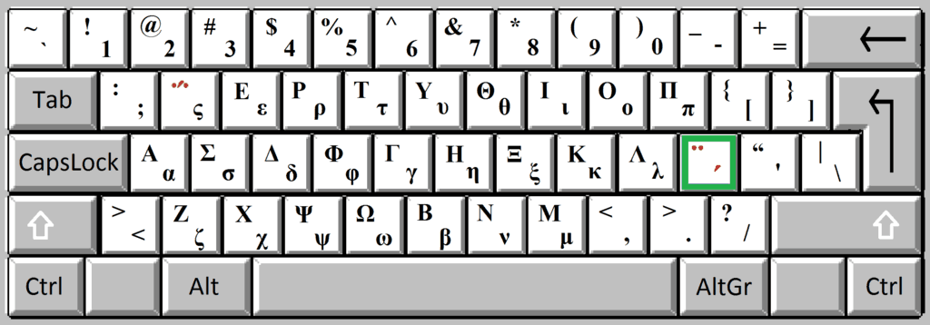 Klawiatura grecka bazuje na popularnym układzie QWERTY, więc większość literek znajduje się tam, gdzie w języku polskim. Jednak położenia literek, które nie mają odpowiedników w alfabecie łacińskim, trzeba będzie po prostu zapamiętać. Poniżej podaję, które to literki.
