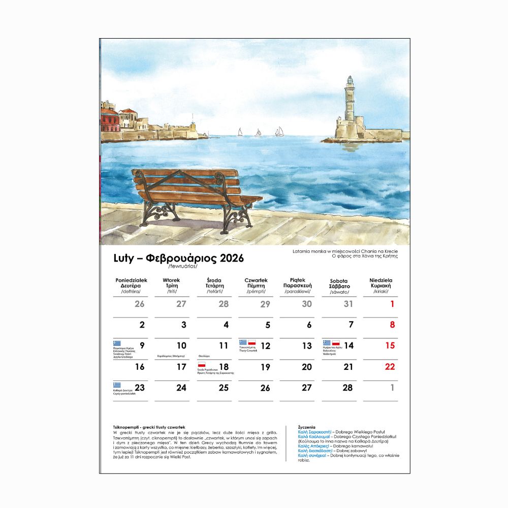 Kalendarz polsko-grecki 2026 to idealny prezent dla każdego, kto kocha Grecję i jej klimat.